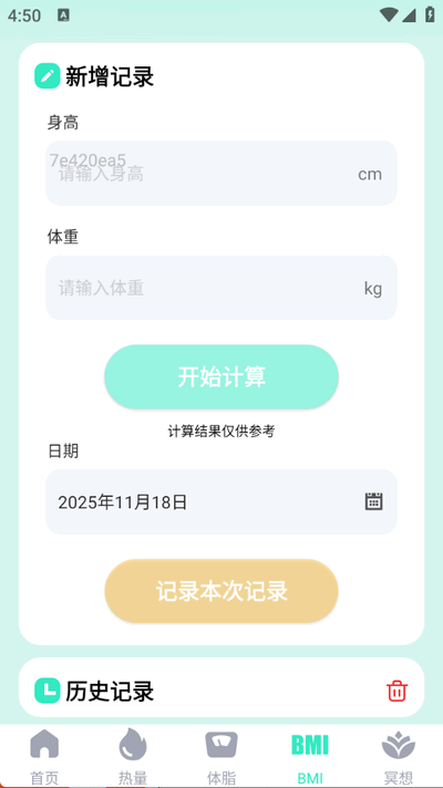 2、首页即呈现食物热量记录、体脂率与BMI监控、以及冥想放松三大入口,一目了然,方便快捷。