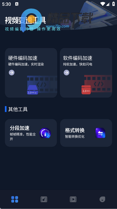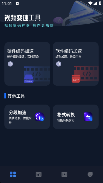 2:进入视频变速工具界面,可选择“硬件编码加速”“软件编码加速”“分段加速”“格式转换”等功能模块,根据需求选择对应视频处理功能。