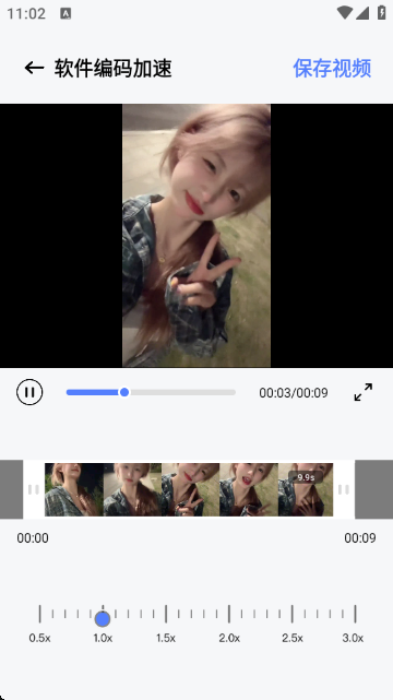 4:以“软件编码加速”为例,选择视频后进入编辑界面,可调整视频变速速率(0.5x-3.0x),预览变速效果后点击“保存视频”完成处理。