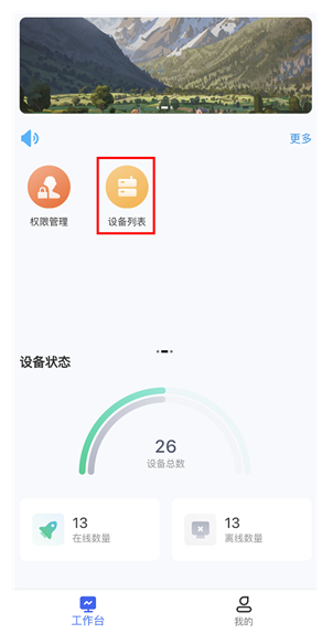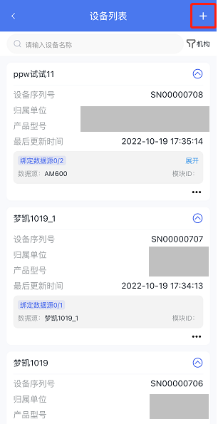登录手机APP平台,选择“工作台>添加设备”,进入“添加设备”界面。
