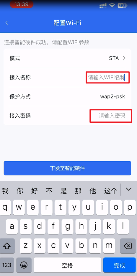 二:将智能硬件接线上电。确保智能硬件处于 AP 模式,直到准备就绪且手机连上模块热点,才能进入下一步操作。