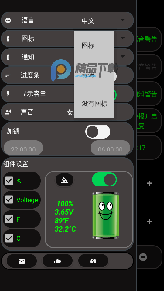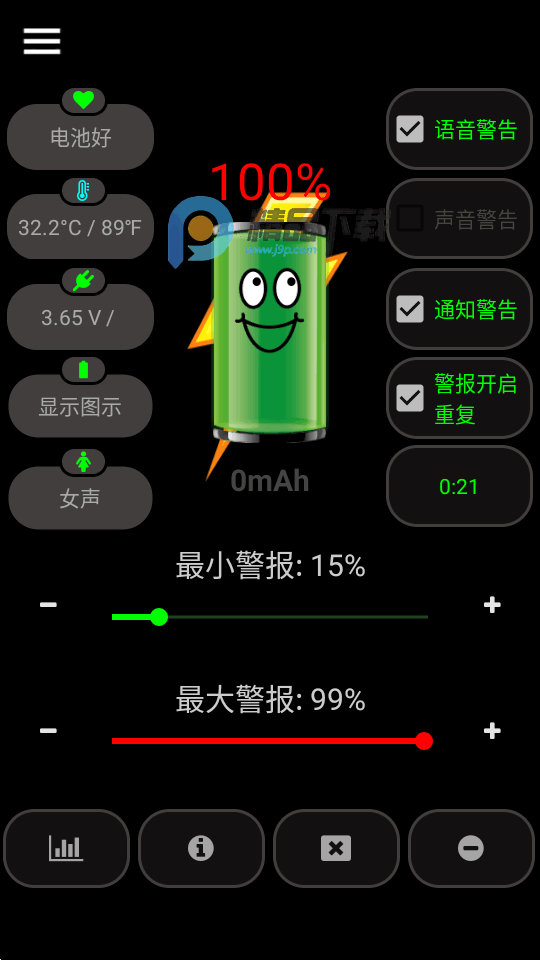 现在的智能手机总感觉电池不耐用,怎样更好的保护你的手机电池的寿命非常重要,这里推荐一款Battery Alarm PRO电池警报app它可以更方便的检测手机电池状态,电池充电的百分比,电池健康状况,电池温度和电池电压,轻松了解是什么应用导致电池发热过快等参数,很简单易用。