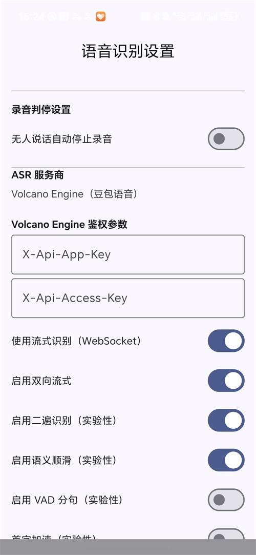在设置中选择"语音识别设置",选择你想使用的 ASR 服务商,并填入相应的 API 密钥。每个服务商都有详细的配置说明。