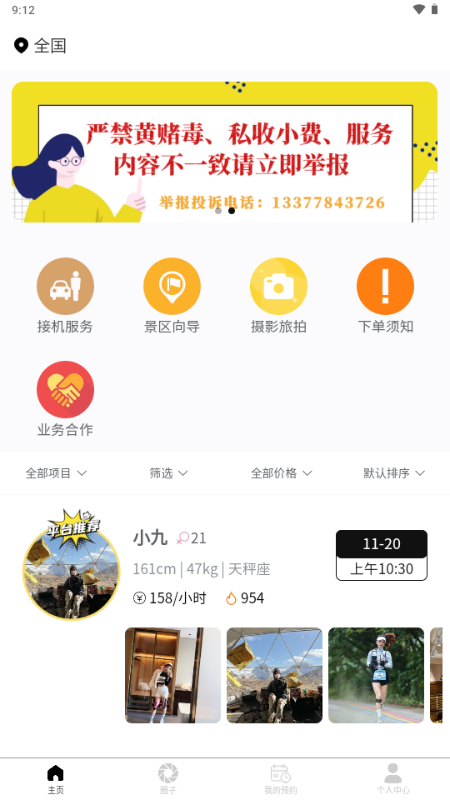 Tips:严禁任何形式的色情暗示、身体接触、涉黄服务;若您发现任何服务人员存在擦边、诱导、非法交易、引导私下联系等行为,请立即联系客服举报处理;若您与服务人员产生任何纠纷(如服务质量、退款、误解等),建议您优先通过客服发起协商,平台可在合理范围内提供调解支持。其他额外费用说明