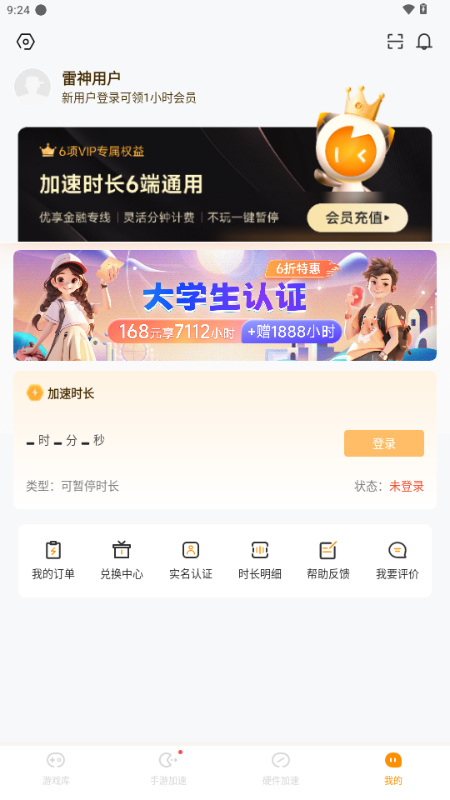 2、就自动进入到个人中心界面,在这里你会看到我的订单、兑换CDK/口令、加速时长明细、实名认证等功能,选择“兑换CDK/口令”。
