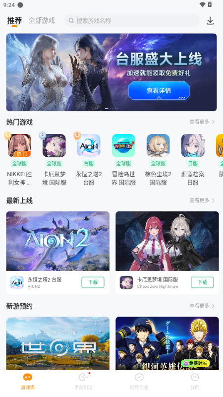然后打开雷神加速器app,并进入主界面【手游】,这个界面包含常玩加速、全部游戏、即将上线这几个部分,点击左上角的三横图标。