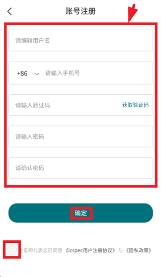 在账号界面输入用户名,手机号,验证码,密码,勾选登录即代表您已同意 《icspec用户注册协议》与《隐私政策》,点击确定即可