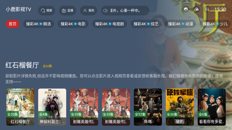 小鹿影视 TV是一款免费的观影平台,界面简洁无广告,操作适配遥控器。用户可以随时随地观看最新最热的电影、电视剧和综艺节目,享受高清画质和便捷操作,整合了各大视频网站及直播平台的海量资源,支持搜索和分类筛选功能,方便用户快速找到喜欢的内容。