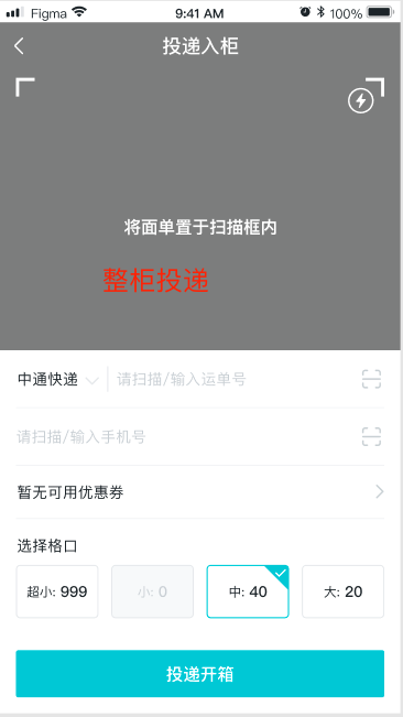 识别完成后选择合适大小格口点击开箱,手机即开始播报开箱成功以及格口位置,请在放入快递后关上格口门并选择确认投递;