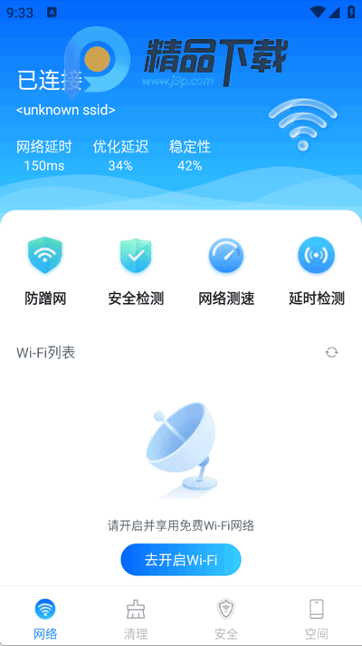 1、打开软件进入首页,具有防蹭网、安全检测、网络加速等功能