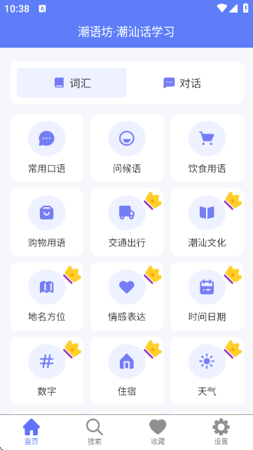 1:打开潮语坊APP,在首页可选择“词汇”或“对话”分类,进入不同场景的潮汕话学习板块,如常用口语、问候语、饮食用语等。