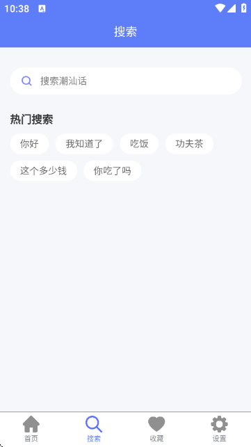3:在搜索板块,可通过搜索框输入关键词搜索潮汕话内容,也可点击热门搜索词条快速查找常用表达。