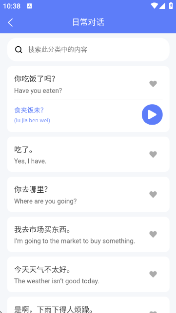 2:进入日常对话板块,可查看各类日常对话的潮汕话表达,点击播放按钮可听取发音,学习地道表达。