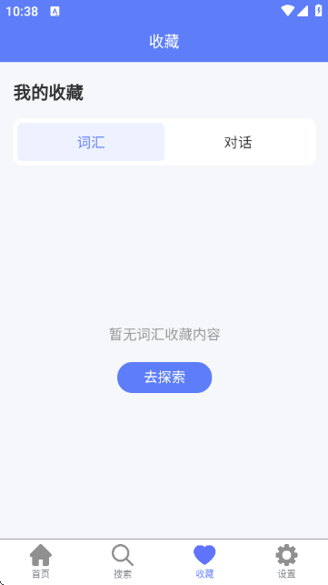4:在收藏板块,可查看已收藏的词汇和对话内容,方便复习重点知识;若暂无收藏,可点击“去探索”寻找内容进行收藏。