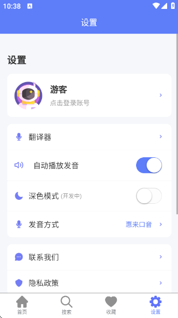5:在设置板块,可进行账号登录、翻译器设置、自动播放发音开关、深色模式切换、发音方式选择(如惠来口音)等操作,个性化定制学习体验。