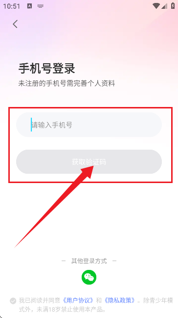 3、然后进入到的是软件的登录界面,如图所示。这里支持手机号登录和微信登录。