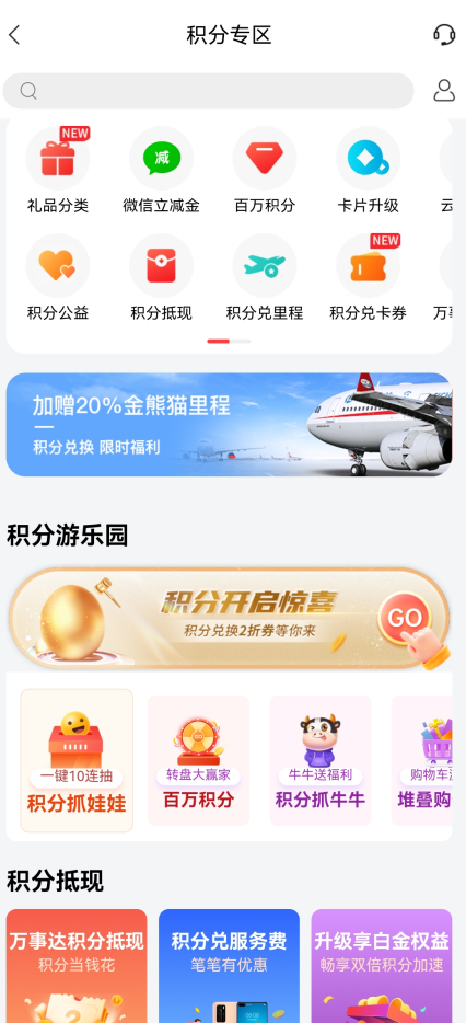 3、下滑可以看到积分有很多种使用方式,比如兑换里程、兑换卡券、抓娃娃、抵现、卡片升级等用途。