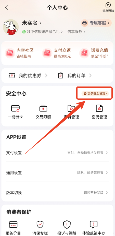 3、找到安全中心的【更多安全设置】,就是这一排小字。