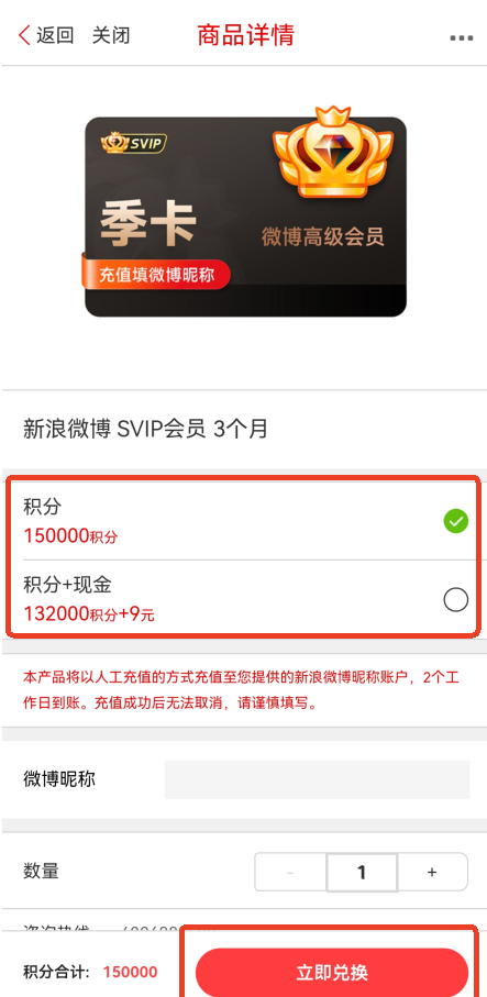 5、点击一个你感兴趣的,进去之后有两种方式兑换,第一种是积分兑换,第二种是积分+现金组合兑换,因为是虚拟物品,所以需要输入相应的平台账号信息,完成之后点击立即兑换。