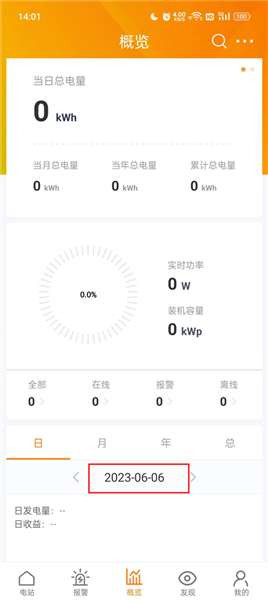 1、在首页点击中间的概览,在这里可以看到当日的总电量;