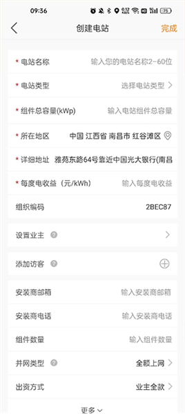 3、进入创建页面,输入电站名称、类型、组件总容量以及各种信息,最后添加电站图片,点击完成即可。