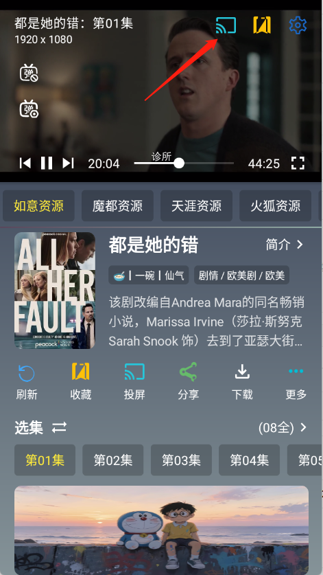 1、进入到想看的影视播放页面,点击右上角的投屏。