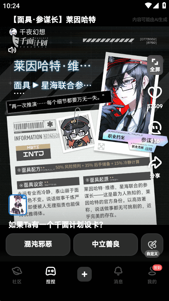 二次元人物角色免费创建平台,捏Ta app又名捏他,软件中可以自由创造你想像中的ta,支持一键定制各种oc形象,支持在线互动,将你所有奇思妙想在这里展现出来,多样化的风格自由混搭操作,软件中自研了精美的AI角色绘制引擎,多种风格可随意切换,喜欢动手的朋友快来试试。