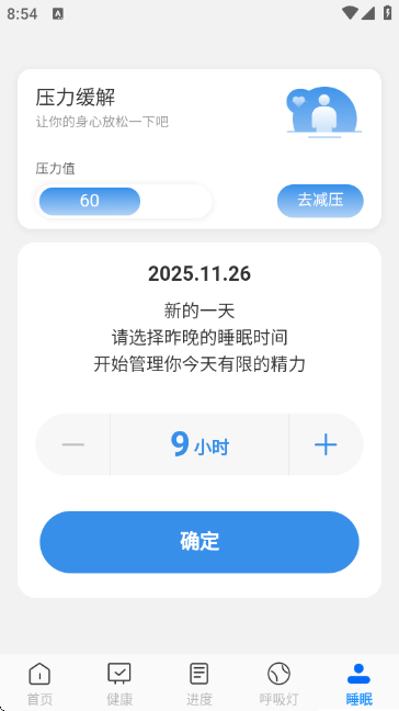 4:“睡眠”模块中,显示当日压力值,可选择昨晚睡眠时间(默认9小时),点击“确定”完成设置。