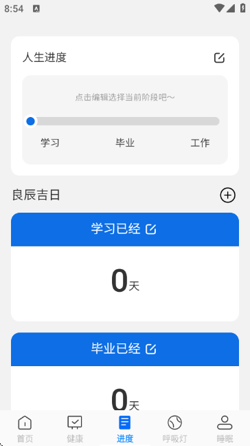 2:“进度”模块中,可编辑人生阶段(学习、毕业、工作),并显示各阶段已进行天数。