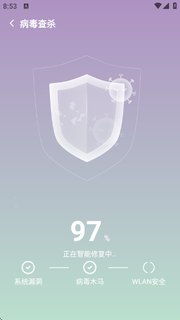 6:进入病毒查杀页面,系统进行智能修复,当前进度97%,涵盖系统漏洞、病毒木马、WLAN安全等检测项。