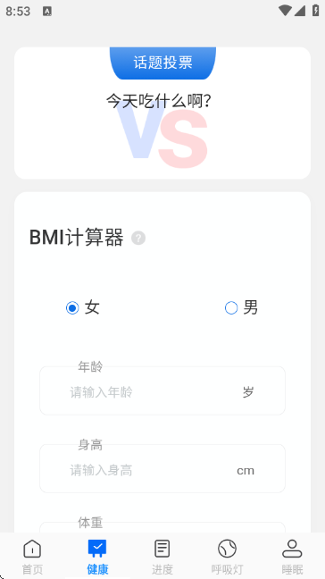 1:在“健康”模块,可参与话题投票或使用BMI计算器,需选择性别并输入年龄、身高、体重等信息。