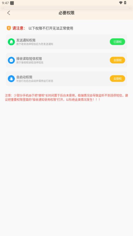 1、打开软件在首页中即可点击开始服务,同时可以开启各种必要权限和重要权限;