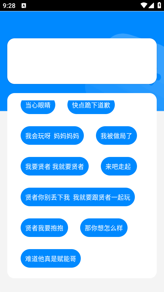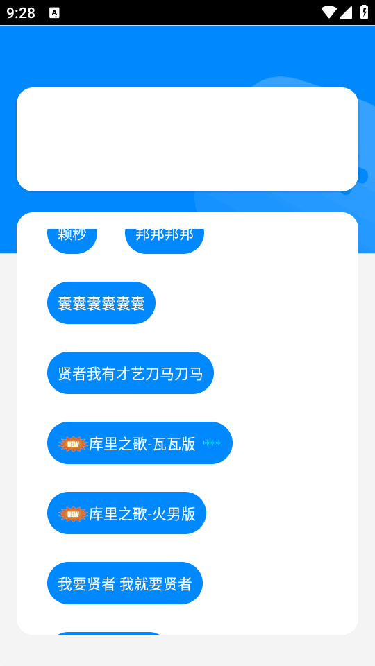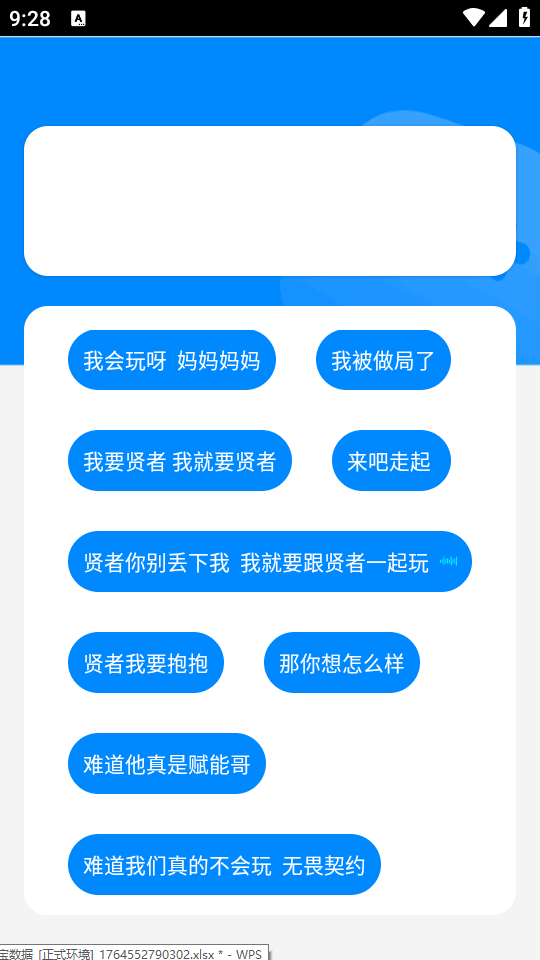 最近抖音上非常爆火的一个语音盒子,瓦瓦语音盒精简版本,所有音频来源主播瓦瓦,因为他搞笑的无畏契约语音动画而走红,用户可以通过播放瓦瓦动画中“捷风”的搞笑语音,如“颗秒”、“贤者我有才艺刀马刀马”、“难道他真是赋能哥”等,玩起来十分有趣搞笑。