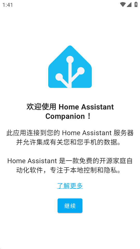 1、欢迎界面:当您首次打开应用时,会看到 Home Assistant Companion 应用的欢迎界面,并有“连接我的 Home Assistant”或“了解更多”选项。