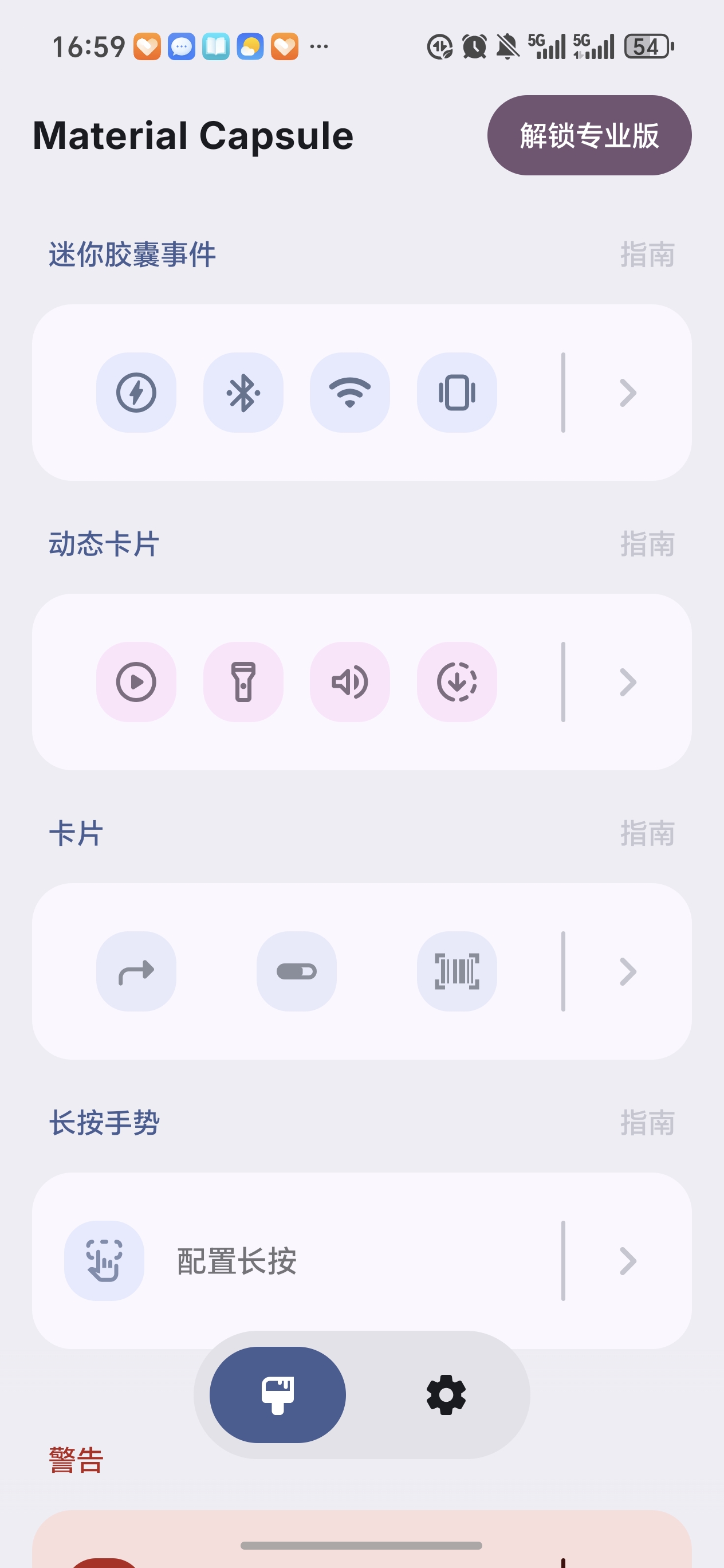 专门为安卓用户打造的一美观时尚的新灵动岛软件,Material Capsule专业版,打开软件后需要先开启一下加速器才可以解锁,不开的话就是免费版本也可以使用,可以自主更改灵动岛的显示,自定义相关的大小和参数,可以设置动态卡片等信息,喜欢diy手机显示的可以试试。