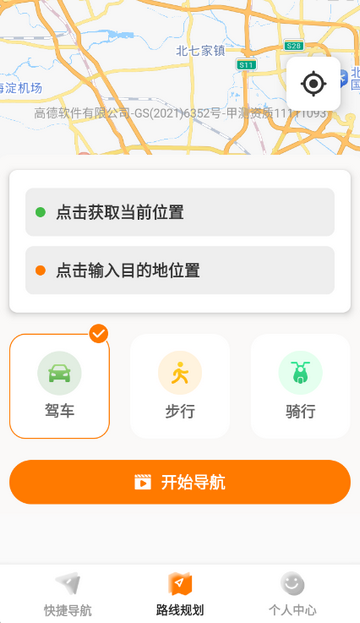 1、打开实时路况卫星导航app,进入后在路线规划界面选择当前位置和目的地,选择出行方式,点击开始导航