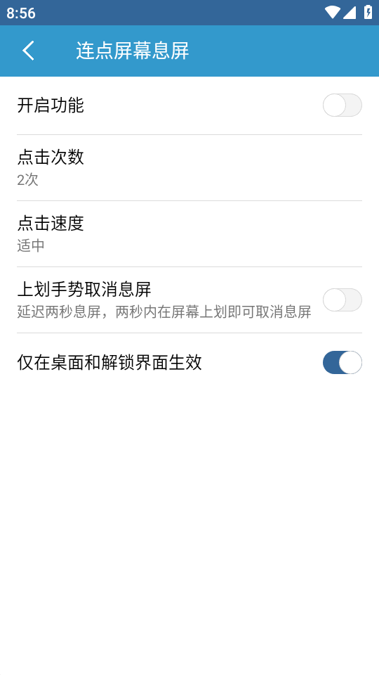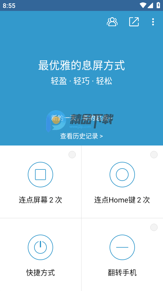 手机上的电源键如果经常用很容易损坏或者失灵等形象,为了解放你的电源键让你更加优雅的息屏,可以下载这款轻息屏app,软件可以随意组合搭配使用,轻点屏幕息屏,连点home息屏,桌面小插件快速息屏,还有翻转手机自动息屏。