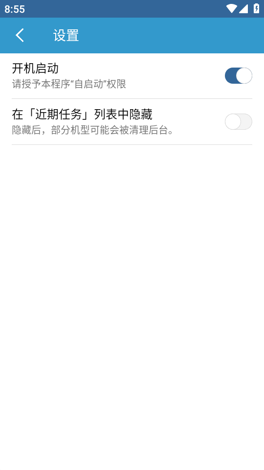 另外,本软件默认不会显示在最近任务列表中,可能导致无法添加至系统的白名单,这时候只需要在本软件的设置界面,关闭”"在最近任务列表中隐藏”即可。