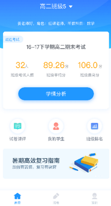 1、查看最近考试分析/试卷讲评/我的学生/班级排名