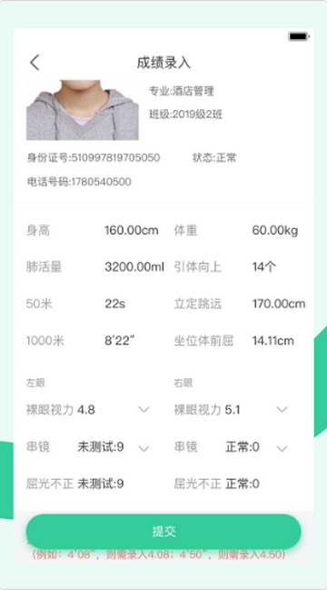 2、在体质测试中要先将自己的学校名称、姓名、职务、手机号码填写好,点击提交按钮就可以看到自己的体侧成绩了。