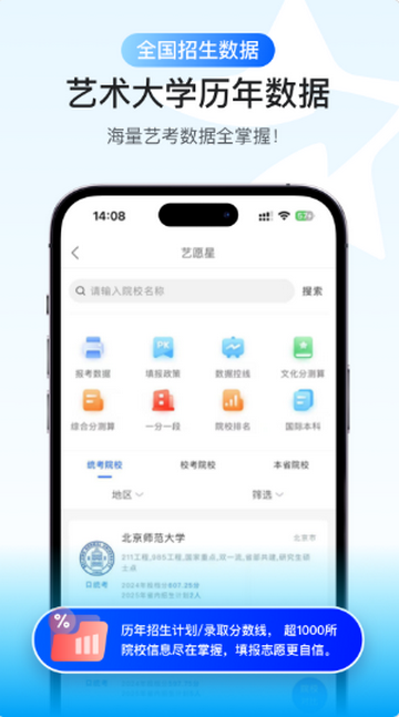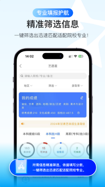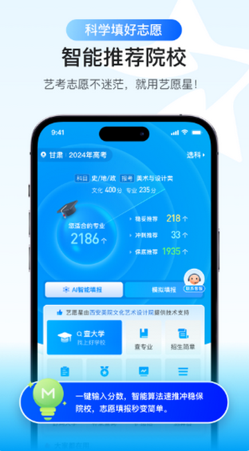 准确的,开发艺术类院校梯度评估模型,通过智能匹配系统+个性化冲刺方案,帮助考生规避滑档风险,实现院校选择与专业发展的双向优化。艺考大数据精准预测、艺术类志愿填报规则深度解析、文化课与专业课权重智能换算三大核心功能,助力艺术生圆梦理想院校。