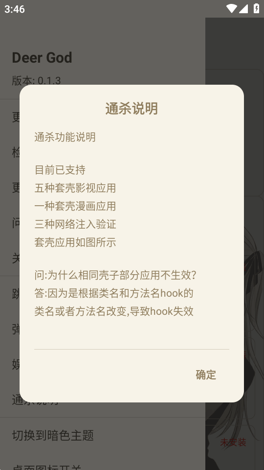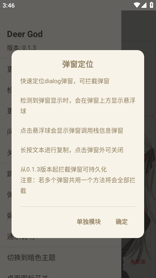 新出的一款很强大的会员xp模块,Deer God模块下载,专注于优化和增强安卓用户体验的工具,可以去掉部分应用的广告,解锁会员功能,还可以捕捉应用弹窗,更加方便用户逆向操作,还支持悬浮球功能,可以实现持久化拦截弹窗、自动跳过界面等功能,可自行下载使用。