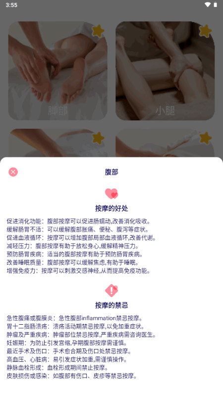 急性腹痛或腹膜炎:急性腹部inflammation禁忌按摩。