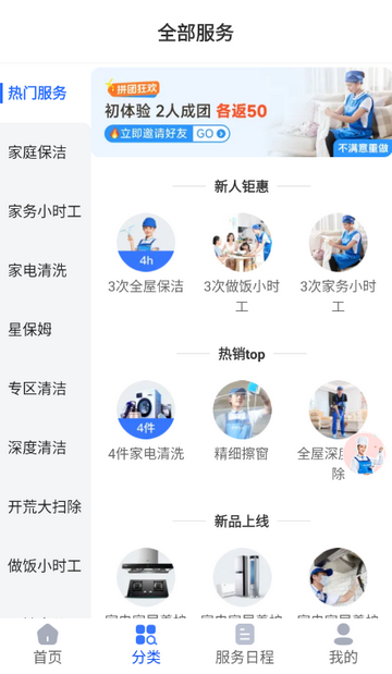 2、让我们切换到【分类】页面之后,我们还能看到所有的服务商品分类,如高端保洁、星保姆、科学月子等。