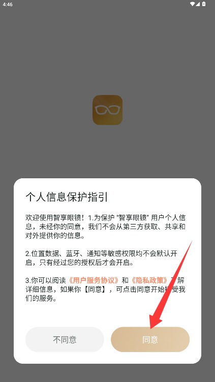 1、初次运行智享眼镜应用时,界面会显示用户协议确认提示,需点击同意按钮才能进入注册页面。