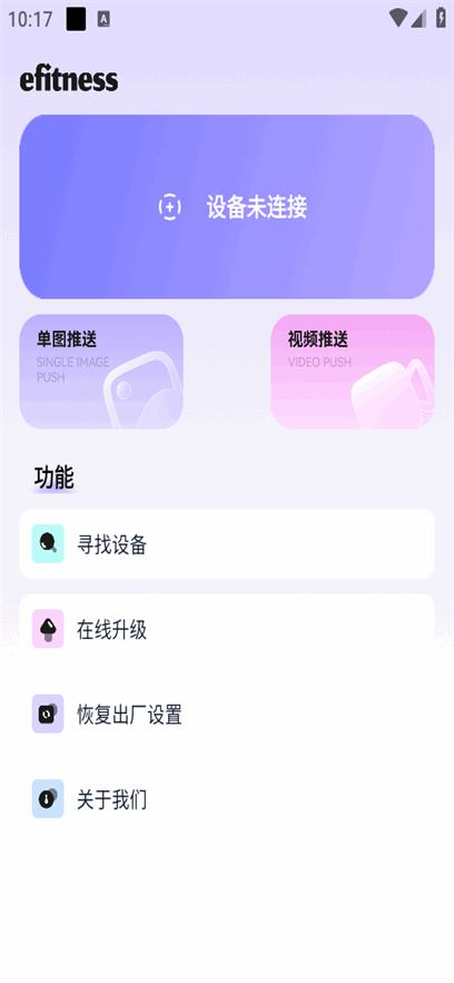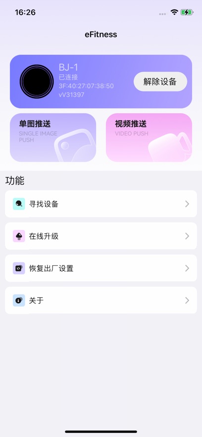 二次元追星吃谷必备的应用软件,电子吧唧app设备连接工具,eFitness软件又名SuperBand,国内安卓手机用户请下载eFitness app,苹果手机请下载SuperBand app,可以一键快速连接设备,支持单图,视频推送功能,快速收集目标,寻找设备,轻松在线升级。