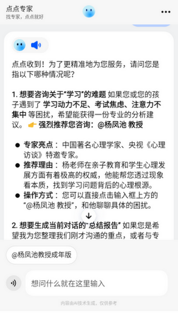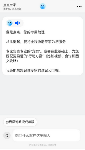 点点专家是一款 7x24 小时智能问答与生活助手工具,以文字 + 语音双交互提供即时响应,覆盖日常问题解答、经验查询、避坑指南、信息总结等场景,解决生活与工作中疑问难快速解决、信息筛选繁琐等问题,让用户轻松获取精准答案与实用建议。