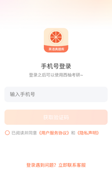 1、打开西柚考研app点击同意服务协议与隐私政策