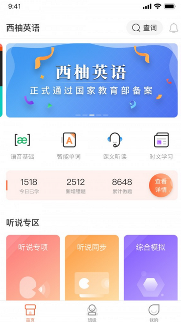 3、进入首页,学习智能单词/课文听读/语音基础等