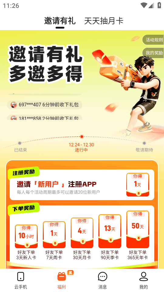 邀请方与受邀方所获的云机奖励,均将在对应活动周期结束7天后失效